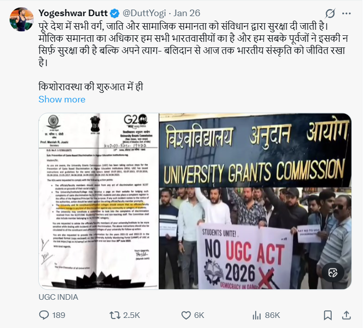 UGC Draft यूनिवर्सिटी ग्रांट्स कमीशन UGC Draft के हालिया ड्राफ्ट गाइडलाइंस को लेकर देशभर में बहस जारी है। इसी क्रम में ओलंपिक पदक विजेता और मशहूर पहलवान योगेश्वर दत्त ने सोशल मीडिया प्लेटफॉर्म एक्स पर एक पोस्ट साझा कर अपनी राय रखी है।